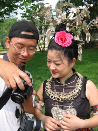 本港訊 5月6日,一位苗族姑娘正在查看自己剛被游客拍下的照片。連日來,數千名少數民族青年男女齊聚凱里,以歌舞表演的方式在街頭、廣場及舞臺展示本民族的風彩,歡慶“黃金周”。他們的表演,吸引了許多身挎像機的外地游客的眼球。