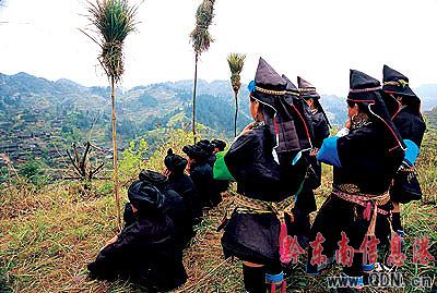 今天恰好是農(nóng)歷三月初三,空申苗寨的“茅人節(jié)”,這是苗寨最為熱鬧的一天。同路來(lái)的小伙子從路邊摘下幾片樹(shù)葉,放在口里很輕巧的吹了起來(lái)。寨前那高高的三米長(zhǎng)的蘆笙,在身著盛裝的小伙子們手里嘹亮而歡快響起。美麗的苗族姑娘端著自制的米酒和三月耙邊跳邊向我們走來(lái)。我定神一看,真的是眼前一亮,姑娘們圍腰后的裙子是如此之短!數(shù)不清的小褶子,厚厚地疊在大腿之上,下面就是白生生的玉腿。真不愧是超短裙的故鄉(xiāng)!