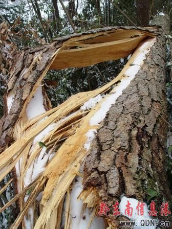 青山界上成片的杉樹林被冰雪壓斷