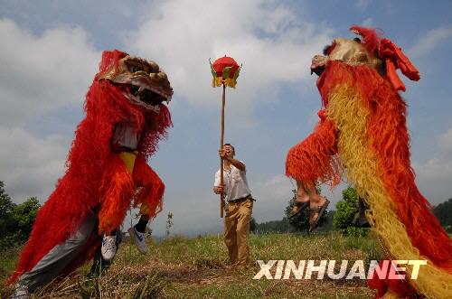 8月9日,村民在表演雙獅搶寶。 新華社發