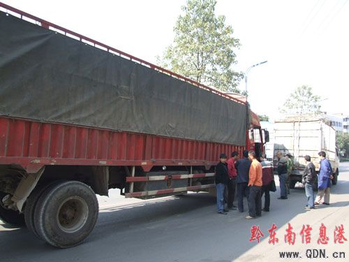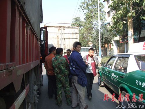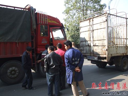 記者在現場看到,東風乘龍大貨車與東風山霸王小貨車歪斜地停在凱里市清江路冷凍廠路段中間,車頭均朝火車站方向,雙方對此爭執不休。
