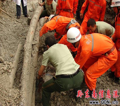 事故發(fā)生后,臺(tái)江縣委、縣政府高度重視,立即啟動(dòng)安全生產(chǎn)應(yīng)急預(yù)案,縣委常委、副縣長(zhǎng)王剛帶領(lǐng)有關(guān)部門于11時(shí)到達(dá)事故現(xiàn)場(chǎng),成立搶險(xiǎn)救援指揮部,并調(diào)來鏟車投入救援,王副縣長(zhǎng)要求要不惜一切代價(jià)營(yíng)救被困人員。此時(shí),挖掘工作仍在進(jìn)行,但未發(fā)現(xiàn)被埋壓的工人。王副縣長(zhǎng)迅速與大隊(duì)指揮員研究救援方案,決定利用鏟車將裝載貨車推翻后在實(shí)施救援。貨車被推翻后,挖掘工作繼續(xù)進(jìn)行。2分鐘后,消防官兵發(fā)現(xiàn)了被埋壓工人,但只有部分身體露在外面,消防官兵迅速利用液壓剪和石塊將被埋壓工人身體上方的樹木支撐,為了防止再次垮塌,消防官兵用雙手一點(diǎn)一點(diǎn)的挪開被困者身上和四周的碎石。經(jīng)過30分鐘左右的緊急救援,遇難工人被成功從碎石堆里救出,經(jīng)現(xiàn)場(chǎng)“120”醫(yī)務(wù)人員初步確認(rèn)已經(jīng)死亡。