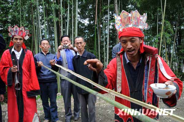 時間:2009-05-29 10:28:45 來源:新華網(wǎng) 5月24日,貴州岑鞏民間儺戲藝人在竹林間進(jìn)行儺戲表演。 據(jù)悉,貴州岑鞏縣的“儺”文化內(nèi)涵豐富,有上千年歷史。岑鞏縣有“儺”文化民間藝人數(shù)百人,“儺”技表演節(jié)目主要有“上刀梯”...