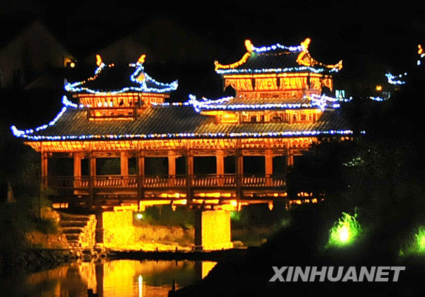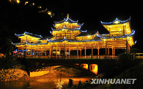 時間:2009-05-30 15:33:50 來源:新華網 這是5月29日晚拍攝的西江苗寨風雨橋夜景。 位于貴州省黔東南苗族侗族自治州雷山縣的西江千戶苗寨有2000多年建寨歷史,有“中國第一苗寨”之稱。1200余戶苗家木質吊腳樓依山而建,層層...