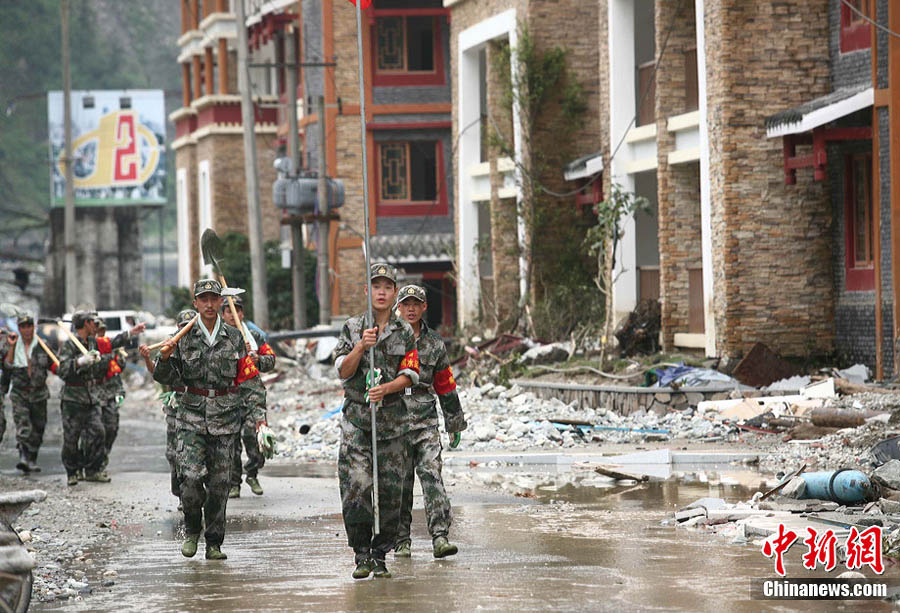 8月18日,經過搶險隊連夜奮戰,汶川泥石流重災區映秀鎮新城水位終于退去,防疫人員、清淤隊伍陸續進入新城展開清潔工作,武警水電三總隊于當日對堰塞體進行第三次爆破。圖為退水后的映秀鎮新城。