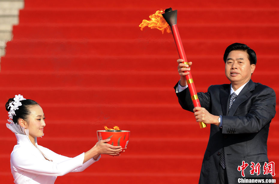 12月3日,采火使者阿迪蘭(左)和周嘉威成功采集亞殘運會火種。當日,廣州2010年亞洲殘疾人運動會火種采集儀式在北京中華世紀壇舉行。兩名采火使者分別是來自新疆特殊教育職業中學的學生阿迪蘭和廣州亞運會三枚金牌得主游泳名將周嘉威。