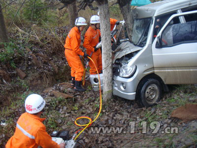 14時50分,消防官兵到達現場,經偵察發現,一輛面包車車速太快剎車不及時,加之下雨路滑,撞在路旁的一棵大樹上,面包車駕駛室已經撞擊變形,坐在副駕駛室的女乘客雙腳擠壓在副駕駛室里,頭部和腿部因劇烈撞擊,被困人員不斷發出痛苦的呻呤。消防指揮員要求參戰官兵在最短時間內救出被困人員。消防官兵根據現場情況利用液壓掌頂器將撞變形的部位向外擴張,騰出空隙,以便拉出被困人員被卡住的雙腿。在救助過程中,消防官兵發現車頭部材料是軟金屬材料,在擴張過程中很容易造成斷裂從而加深傷者的痛苦。消防官兵又利用機動鏈鋸將大樹鋸斷,使其與嚴重變形的車頭分離。15時12分,被困人員被成功救出,隨即被送往醫院進行緊急治救。