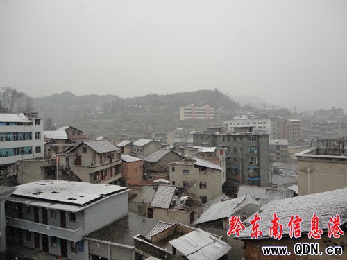 本港訊 (通訊員 潘興隆 攝影報道)12.25圣誕節清晨,黃平下起冬至后第一場雪,片片雪花把小城妝扮成白色的世界。