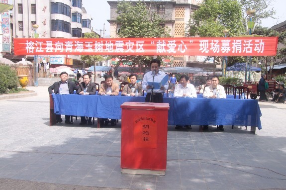 據黔東南州人民政府網消息“一方有難,八方支援”,為支援青海玉樹地震災區抗震救災、重建家園, 4月27日下午,榕江縣在縣街心花園舉行向玉樹災區獻愛心捐贈儀式。縣委書記白躍軍、縣長肖克、縣人大常委會主任楊勝侯、縣政協主席葉東山等縣四大班子領導,縣直部門干部職工及愛心企業、市民2000余人踴躍參加了捐贈儀式,向災區人民奉獻愛心。