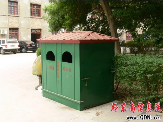 據悉,這批垃圾屋具有容積大、外形美觀、能讓垃圾分類投放和可防破壞等特點。圖為榕江縣委大院里的垃圾屋。