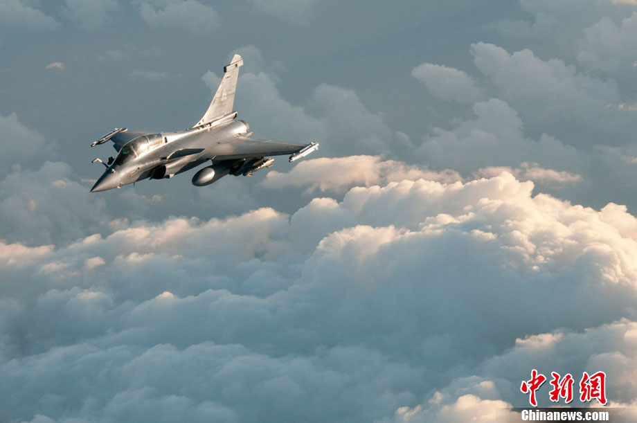 當地時間3月19日,一架法國陣風戰機攻擊利比亞期間由一架空中加油機進行加油作業。