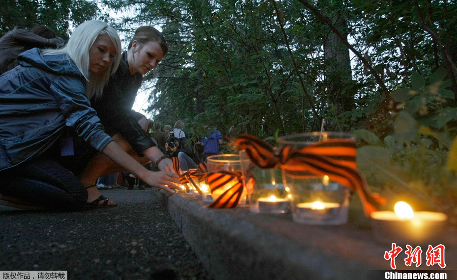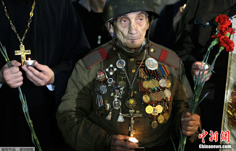 2011年6月22日,俄羅斯首都莫斯科,在克里姆林宮外的無名烈士墓前,市民和二戰老兵手持蠟燭和鮮花紀念“衛國戰爭”爆發70周年。1941年6月22日,德國法西斯突然閃擊前蘇聯,前蘇聯人民開始了艱苦卓絕的衛國戰爭,直到1945年5月2日柏林戰役結束。