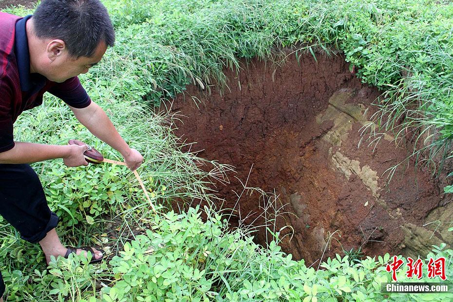 8月26日,在棗莊市市中區光明路街道十里泉村花生地里,環保部門工作人員正在對“天坑”進行測量。山東省棗莊市市中區光明路街道十里泉村是供應城區居民生活用水的水源地之一。今年6月,因天氣干旱,十里泉村地下水位嚴重下降,先后出現18個大小不一的“天坑”,這些“天坑”最大面積56平方米、深20多米。從8月23日開始,當地政府組織人員對“天坑”進行科學填埋,以保證群眾的生命財產安全。 中新社發 吉喆 攝 圖片來源:CNSPHOTO