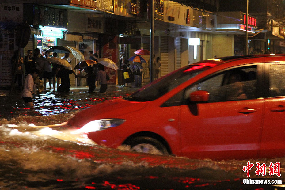 10月5日晚,因強熱帶風暴“尼格”過境引起的暴雨天氣導致海南海口城區多處道路被淹,交通受到嚴重影響。中新社發 洪堅鵬 攝