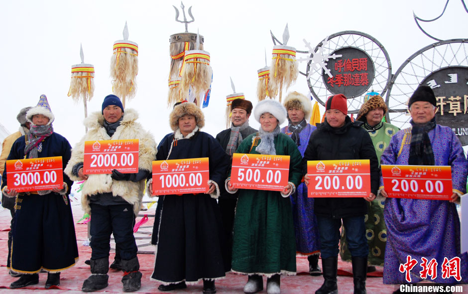 12月2日,2011年呼倫貝爾冬季冰雪那達慕暨巴爾虎草原祭火文化節在內蒙古陳旗金帳汗旅游部落開幕。冬季的呼倫貝爾銀裝素裹,晶瑩剔透,零下20度的溫度,讓巴爾虎草原冰情雪韻,一派歡騰。圖為文化節上的傳統民族體育項目。中新社發 張富 攝 圖片來源:CNSPHOTO