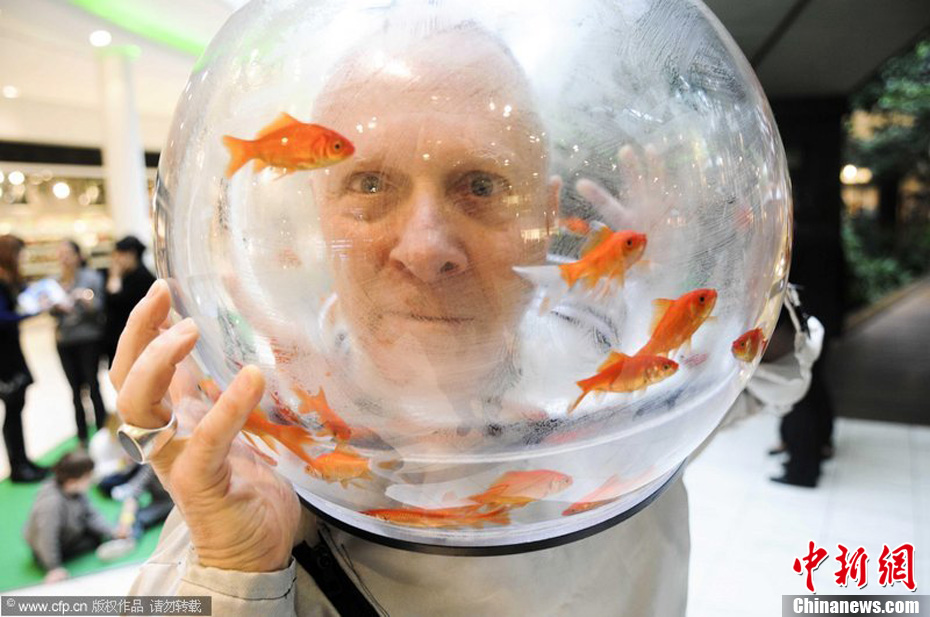 4月1日,法國卡雷塞納爾,美國藝術家Eric Staller戴著一個魚缸式的頭罩到處行走,頭罩里還放進了20條活金魚。Eric出生于1947年,是一位以光影繪畫聞名的藝術家。