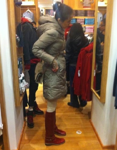 中王祖賢試著一雙紅色中筒皮靴,身材高挑,長發隨意扎在頭頂,擊破早前削發出家的傳聞。