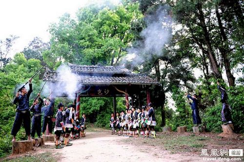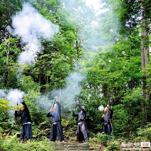 在黃帝時代,苗人已經開始習慣戰爭與遷徙。他們被迫遷徙到深山處。基于生存環境的惡劣,苗人槍不離身刀不離腰。當狼煙散盡,天下太平的時候,防身武器也就離身而去……時至今日,依然有一個苗人分支,男人總是隨著槍與砍刀和剽悍的氣概出現,頑強地延續戰國遺風。這個苗族分支被稱為"最后的槍手部落"--岜沙苗族。為保衛家園,男人們成了這里的守護神,幾百年不屈不撓地斗爭,常年的防范意識形成了與外界隔絕并保存了刀耕火種的生活方式和獨特的民俗習慣,就連小孩們也喜歡在腰間別上一把彎刀。岜沙可能是國家唯一批準個人佩戴槍支的寨子。這里的男人雖然不高,但個個卻像清朝武士,他們身著清服,腰間佩刀,肩上扛槍,從眸子里都透出自信。(攝影:大雛)