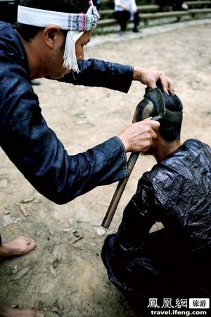 岜沙男人非常重視他們的發髻,發髻在岜沙苗語中稱為:"戶棍",是男性裝束中最重要的性別標志--剃掉男性頭部四周大部分的頭發,僅留下中部盤發為鬏髻,并終生保持這種發式。據說,這種裝束是從蚩尤老祖時代傳下來的,也是迄今為止在中國所能見到最古老的男性發式。人類學者稱這里男人椎髻發式造型是"活著的兵馬俑"。連孩子都知道頭上留的發髻是祖宗傳下來的規矩,是男人的標志,也是力量的象征。如果你撫摸著他們的發髻問剃發時為何不一起剪掉,孩子們會異口同聲地說:"剪掉發髻就找不到媳婦了,曾有日本民族、民俗學家尋根來到黔東南,岜沙人還引起了他們濃厚的興趣,因為日本的武士裝束和岜沙人的裝束幾乎沒有二樣,所以有人認為日本人的祖先是岜沙人。部落民俗文化也仍然留有鮮明的印記,男孩在七歲到十五歲之間,必須舉行一次剃洗禮。行成年禮那一天,男孩邀約幾個年紀相仿的伙伴,上山打鳥,下田捉泥鰍,到山澗摸魚……鳥打得越多,魚捕得越多,表明他的本事越大,將來會有出息。然后,小伙伴們聚集在他家里,喝酒、燒吃捉來的魚鳥。由族長用煮蛋水把鐮刀磨利給男孩剃頭,僅留著頭頂部頭發綰髻(即戶棍),并終生保持這種發式,十五歲接受父親為其準備的獵槍,以標志進入成人可獨立的階段。從此以后,他就可以扛槍掛刀去找女孩唱歌涼月打秋千。