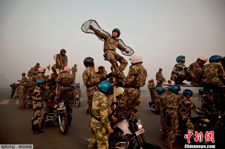 2012年1月11日,印度首都新德里,特技方隊的士兵在摩托車上練習“疊羅漢”特技,迎接即將到來的第63個“共和國日”。1950年1月26日,印度宣布成立印度共和國。每年1月26日,印度都將舉行舉行盛大的游行和閱兵式。