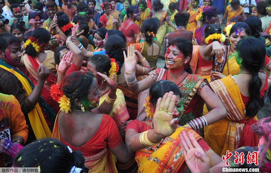 2012年3月6日,印度加爾各答,人們載歌載舞,盡情地用五彩繽紛的顏色裝扮起來歡慶胡里節(jié),迎接春天的到來。
