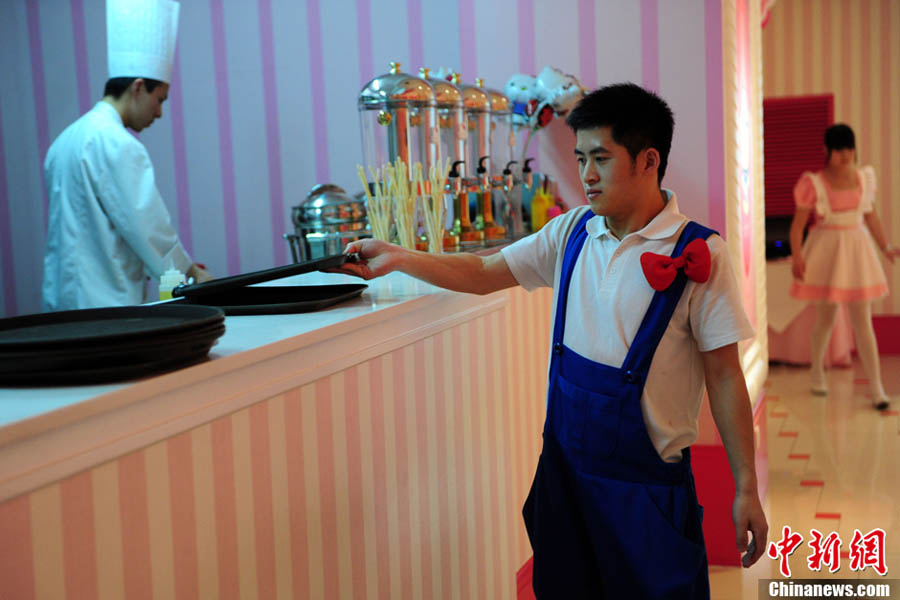 4月11日,亞洲首家經正式授權的日本卡通形象Hello Kitty主題餐廳落戶北京三里屯世茂百貨,顧客在主題餐廳品嘗菜品的同時,還可盡情感受Hello Kitty帶來的魔幻粉色氛圍。餐廳一般人均消費50元到80元不等,營業時間為每日11:00-21:00點。中新網記者 金碩 攝