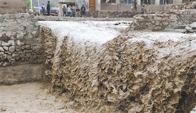 在受災最嚴重的岷縣茶埠鎮,溝門村65歲的村民紀邴祿心有余悸地回憶起冰雹洪災:“剛開始下雨后,家人還沒有意識到,我打著傘上到樓頂,發現村子上游的洪水如猛獸般沖了下來,大量農田和土坯房瞬間就倒了。我大聲喊老伴,帶著孫子們跑到3層樓頂上才躲過了一劫,洪水過后,家里圍墻被沖塌,院子里留下的泥印子有4米多高。”
