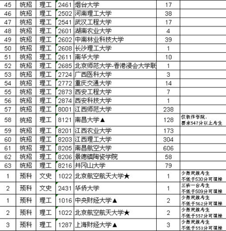 文史類缺額院校較多的省外院校有河北大學21人、哈爾濱工程大學9人、東北林業大學7人、西交利物浦大學7人(中外合作辦學,學費6萬/年),省內院校有江西師范大學114人、華東交通大學36人(不低于570分以上考生)、井岡山大學21人。