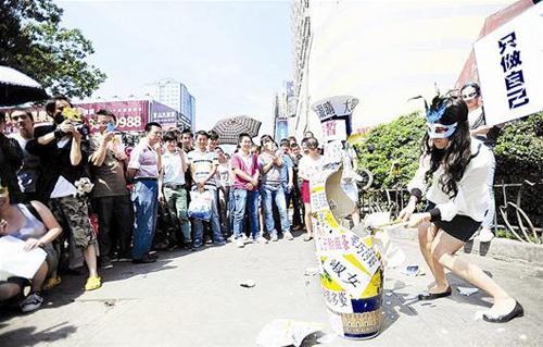 某高校女生在街頭砸花瓶反對大學生選美(組圖)在線投稿 投稿信箱:tougao@qdn.cn 新聞熱線:8222000 投稿QQ:449315