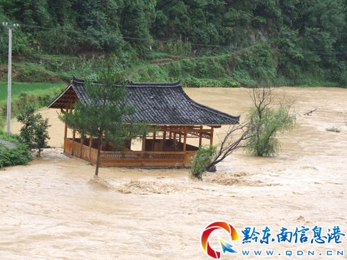 目前,該縣抗洪救災(zāi)工作正有序開展。圖為郎德小河驟漲,水碾房處于四面洪水中。(潘國雄 李世周)