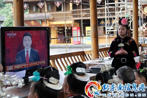 雷山西江千戶苗寨97%以上都是苗族,為了讓村民及時全面了解黨的十八大的會議精神,西江苗寨特別組織村民到寨中的風雨長廊集中收看十八大開幕式,在現場專門配備了一名苗語翻譯。