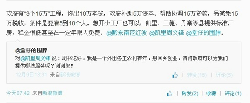 從周文峰的回復我們不難看出他的回復之用心,超出了140個字就分成兩部分來發,只為盡量詳細地為網友解答。同時,該微博還引來了其他網友的關注,@wo-lf也參與解答,他說:“政府有3個15萬工程,你出10萬本錢,政府補助5萬資本、幫助協調15萬,另減免15萬稅收,條件是要雇5到10個人。想開小工廠也可以,凱里、三穗、丹寨等縣提供標準廠房,租金很低甚至在一定年限內免費。”