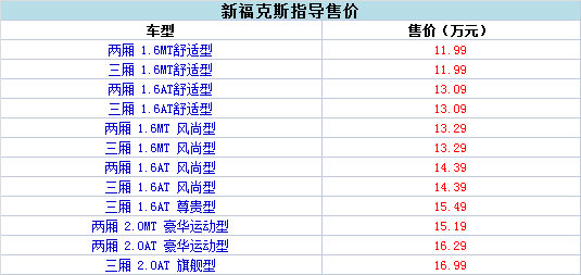 車天下汽車網訊 4月23日,新福克斯(報價 參數 圖片 論壇)在北京車展中正式上市。新車在動力上搭載了1.6L和2.0L兩款發動機,而根據配置差異共有9款車型供消費者選擇。新福克斯的市場指導價為11.99-16.99萬元。