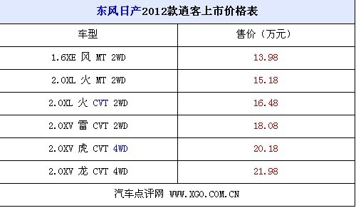 中新網訊 今日從東風日產官方獲悉,2012款逍客今天正式上市,新車共推出六款車型,動力方面搭載的依然是1.6L和2.0L兩款發動機。2012款逍客的市場指導價為13.98-21.98萬元。具體售價見下表: