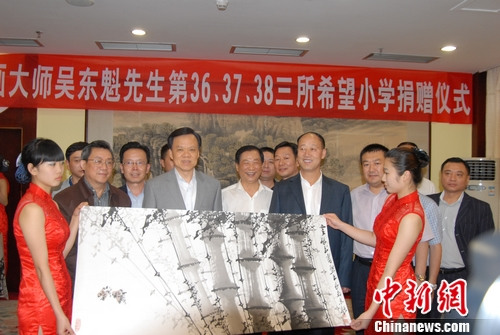 據(jù)中新網(wǎng)消息 近日,著名國(guó)畫(huà)家吳東魁奔赴貴州,向織金縣綺陌中心學(xué)校、凱里市巖腳小學(xué)和岑鞏縣水尾鎮(zhèn)中心小學(xué)各捐贈(zèng)現(xiàn)金30萬(wàn)元及兩幅畫(huà)作,繼續(xù)履行自己“活到老、畫(huà)到老、捐到老”的承諾。據(jù)悉,這是他捐贈(zèng)的第36、37、38所希望小學(xué)。