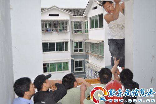 6月14日18時18分,臺江大隊接到報警稱:錦繡前程小區(qū)一幢住宅樓7樓,有一名中年男子被困窗外,情況危急,請求消防官兵前往救援。接到報警后,大隊迅速出動2車9名官兵趕赴事故現(xiàn)場。