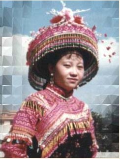 黔中南型,流行于貴州中南部以及黔、桂、滇交界處。女裝上衣多披領(lǐng)、背帕等,下裝有一青色百褶裙,也有蠟染裙。以挑花為主,兼用蠟染。貴陽、安順、安龍等地的花溪式女裝,其披領(lǐng)酷似一面旗幟,俗稱“旗幟服”,花飾也多。海南型,流行于海南省。女裝多為右偏襟青布長衫,蠟染布筒裙,花飾少。