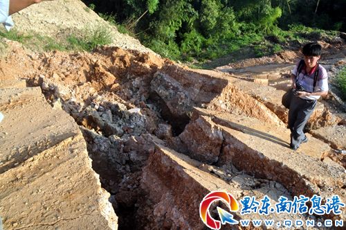記者沿著坡面繼續前行,路途的道路全是大裂縫,非常難走。行至半山腰后,遇到了一個中間部位(系道路)出現不少斷層的坡面,從坡面的底部到頂部,大約有三十米。當地一位村民告訴記者:“你們有所不知,坡下的道路與坡上的道路原本是平行的,是一條路,但滑坡之后,形成了30米的落差。”