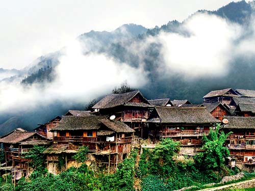 西江苗寨的房屋均是杉木結構,依山傍水,次第升高相連。有平房、樓房、半邊吊腳樓房等式樣,用青瓦或杉木皮蓋頂。基腳用青石塊、鵝卵石壘砌。木樓最大的五間,一般為三間搭一廂閣,均是三層樓。第一層存放農具,關養牲畜、儲肥;第三層存放谷子或其他農作物;第二層住人,設有堂屋、灶房、臥房、客房。堂屋中央擺著一張木制花邊長桌,為迎客宴席之用。堂屋前為曲形木條欄桿,供夏天乘涼和休息。木樓前左右板壁上雕刻有各種花鳥圖案,門窗用小木條裝成花邊圖案。房屋具獨特的民族風格,既美觀大方,又舒適清爽。房前屋后的不遠處,建有晾禾架和谷倉。房與房之間的路用青石鋪砌連通,并有排水溝;有的人家房前屋后還用小鵝卵石砌鋪。