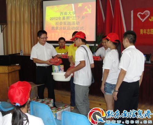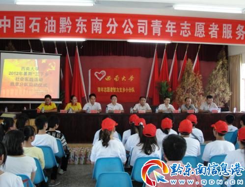 近日,中國石油貴州黔東南銷售分公司青年志愿者服務隊聯合西南大學2012年暑假“三下鄉”社會實踐活動凱里分隊,組織開展了赴凱里市旁海鎮進行助農幫困活動,活動啟動儀式在旁海鎮鎮政府會議室進行。旁海鎮政府、旁海鎮中心學校等相關負責人參加了本次啟動儀式。