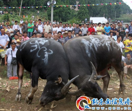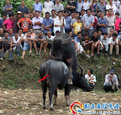施秉縣雙井鎮將于8月25-27日舉行第三屆蝴蝶媽祖節斗牛比賽活動,此次斗牛比賽分小牛、中牛和大牛三個組別,眾牛按組別及所報名次比賽,既考驗斗牛實力,也考驗牛主智慧。比賽分兩天進行,頭天進行是小牛比賽。好比是拳擊比賽,小牛就是輕量級的,雖然沒有重量級比賽經常“KO”的痛快刺激,但是小牛閃展騰挪,憑借“點數”取勝也驚險精彩,博得觀眾陣陣喝彩!為保護斗牛遭受大的傷害,只要兩牛相持超過10分鐘,組織人員就上前拉開,按規定,胸圍、牙口、角寬處于劣勢的一方獲勝。(龍冠宇)