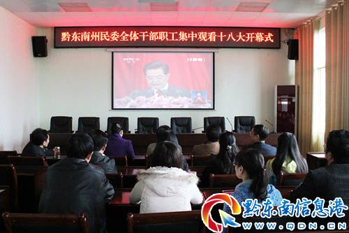 11月8日上午9點,黔東南州民委在家領導干部和全體職工,在州民委六樓會議室準時收看黨的十八大開幕式。
