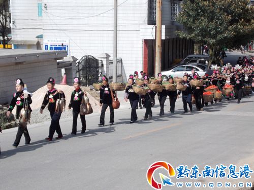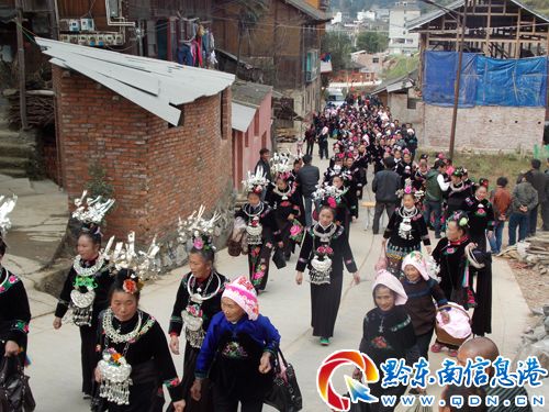 12月6日中午,120名雷山籍苗寨姑娘身著苗寨盛裝、便裝,抬著魚、鴨、酒、糯米飯以及糖果等禮品從雷山縣城北門向該縣丹江鎮黨高村走來。當地男女老少在寨門設12道攔門酒迎接她們回娘家參加苗年鼓藏節蘆笙盛會。