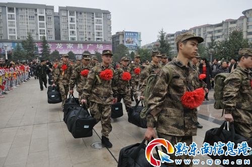 “向前,向前,向前,我們的隊伍向太陽,腳踏著祖國的大地,背負著民族的希望……”12月11日下午3時30分,伴隨著雄壯的中國人民解放軍軍歌的旋律,60名岑鞏籍新兵英姿颯爽,身穿迷彩服、胸前別著大紅花,每人手里拎著一個軍用行李袋,背著疊得棱角分明的軍用被子,離開家鄉奔赴軍營。