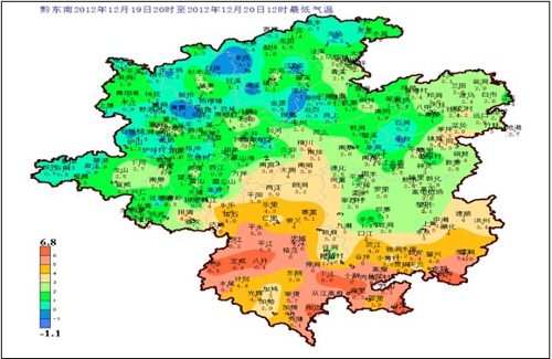 根據(jù)我州區(qū)域自動氣象站監(jiān)測,受東北路徑冷空氣影響,19日夜間以來全州陰轉(zhuǎn)小雨,氣溫下降,其中鎮(zhèn)遠羊場、黃平黃飄、三穗滾馬、施秉白垛、臺江方召、岑鞏天馬、雷山高巖、凱里老山等8縣市18站最低氣溫降至0℃以下,鎮(zhèn)遠羊場和黃平黃飄-1.1℃最低(見附圖1)。