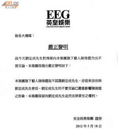 英皇娛樂發出的嚴正聲明指,陳偉霆從不認識劉定成,也從來沒有與劉會面。聲明指劉定成的不實言論已嚴重影響陳偉霆之形象,該集團會保留向劉追究法律責任之權利。陳偉霆昨響應事件時也表明:“絕對沒有這件事,不明白為什么有人拿我來開玩笑,但公司連到底有沒有這件事都沒有問過我!”英皇藝人管理及唱片部總監霍汶希也怒轟:“這個人的言論不可信,影響到公司旗下藝人!”