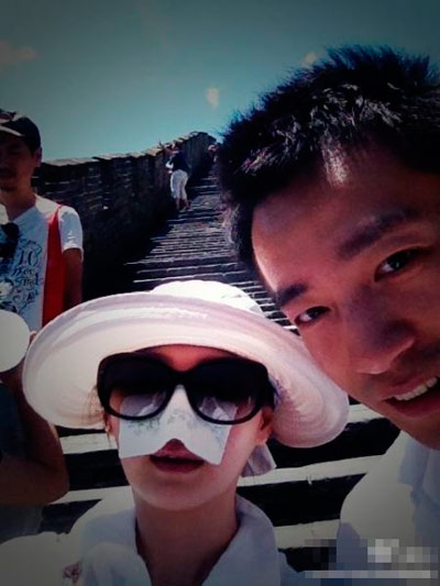 7月2日22時(shí)14分,大S在微博上放出一張與老公汪小菲同游長城的相片。相片中,大S頭戴大遮陽帽,眼戴大黑框墨鏡,并在鏡架處夾上一張面巾紙擋住鼻部吸汗,僅露出嘴部。她在微博中說,“不到長城非好漢?以後請(qǐng)叫徐某人:好漢好漢好漢好漢!”
