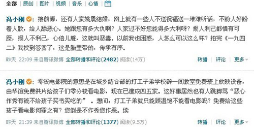 隨后,馮小剛連續發兩條微博,進行回應,“零錢電影院的意思,是在城鄉結合部的打工子弟學校辟一間教室免費裝上放映設備,由華誼免費供片給孩子們零分錢看電影,現在已建成四五家。這好事居然也有人跳腳罵‘惡心作秀有錢不給孩子買書買吃的。’ 想問:打工子弟就只能顧溫飽不能看電影嗎?免費給這些孩子看電影何罪之有?您倒是不作秀您作惡。”