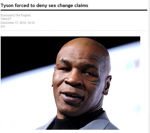 最先爆料泰森接受變性手術(shù)的是一家非洲的名字叫做SpyGhana的網(wǎng)站,報(bào)道稱泰森經(jīng)歷了16個小時的變性手術(shù),已經(jīng)從邁克變身為女人“米歇爾”,并用“鐵娘子”取代自己長期使用的“鐵邁克”綽號。