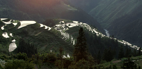 時值貴州省黔東南水稻育秧春耕季節,榕江、從江兩縣的月亮山區梯田,與蜿蜒的大山,茫茫的森林,錯落的苗侗村寨,在霞光和月色的映襯下,構成一幅幅連綿的畫卷,吸引了不少省內外游客和攝影愛好者到這里旅游觀光、攝影。